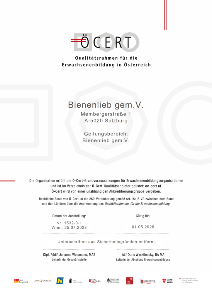 Die Zertifizierung betrifft alle Bildungsangebote von Bienenlieb und der imker.ag (eine Marke von Bienenlieb, für den Bereich der Imker Aus- und Weiterbildung).