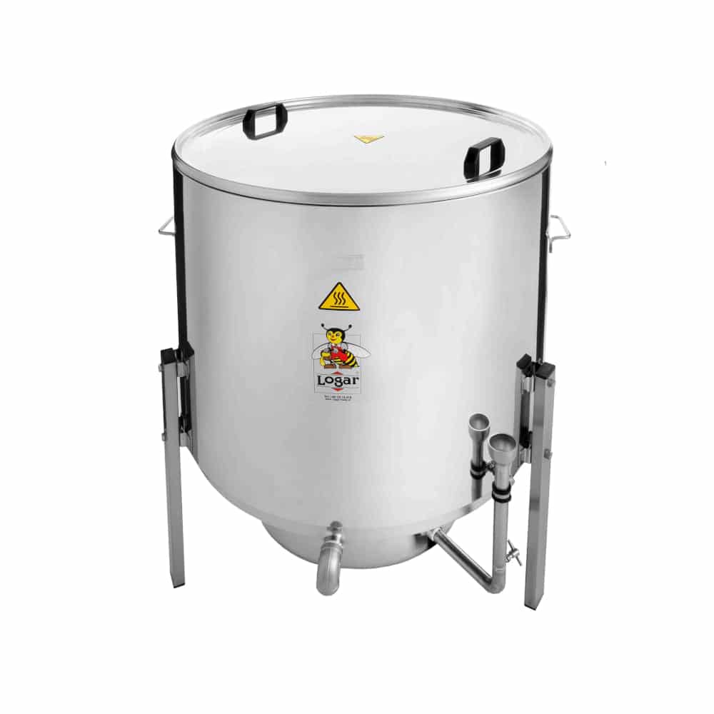 - Ebenso eignen sich Dampfwachsschmelzer. Hier wird das Wachs von Wasserdampf geschmolzen und durch ein Auslaufrohr abgeleitet. Falls inkludiert, ermöglicht das Gerät auch die Desinfektion der eingebrachten Rähmchen. Die Dampfwachsschmelzer lassen sich sowohl mit als auch ohne Dampfmeister (elektr. Dampferzeuger) und Desinfektor erwerben.