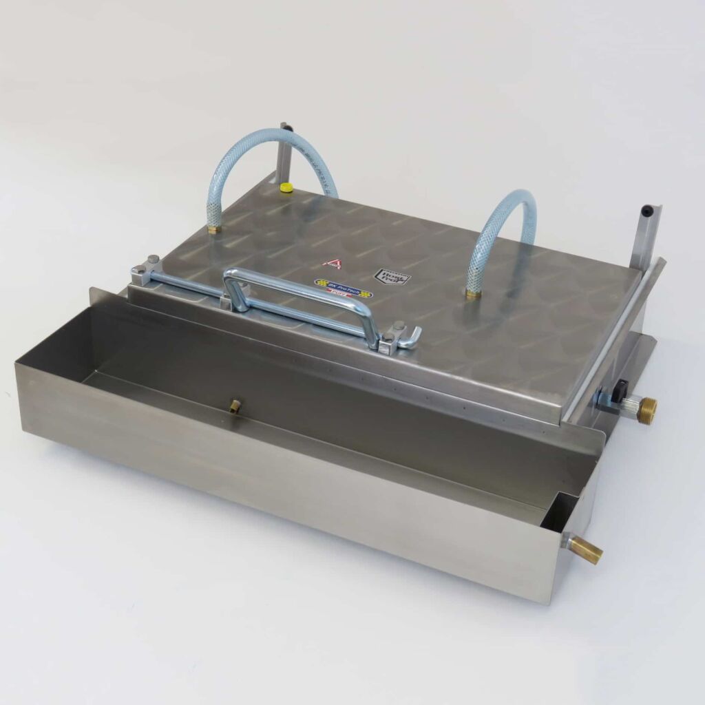 Im nächsten Schritt können aus dem geklärten Wachs Mittelwände hergestellt werden. Für eine zeiteffiziente Herstellung eignen sich hierbei spezielle Mittelwand Gießanlagen. Diese lassen sich für alle gängigen Maße erwerben. Aufschläge für die Zellmaße 4,9 mm, 5,1 mm, 7,0 mm und Schneidschablonen sind ebenfalls erhältlich.