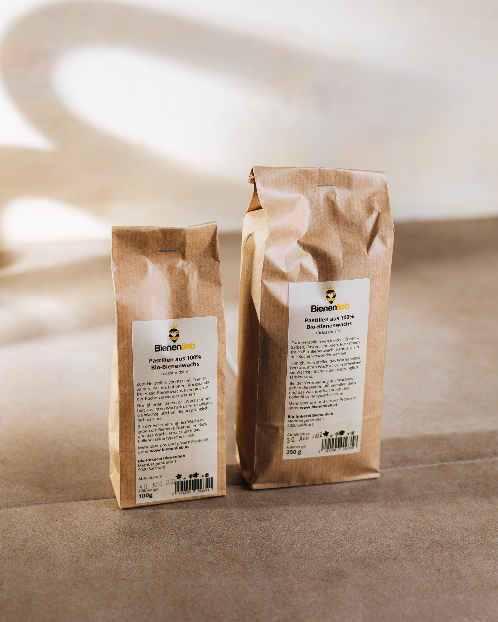 Zum Herstellen von Kerzen, Cremes, Salben, Pasten, Lotionen. Rückstandsfreies Bio-Bienenwachs kann auch in der Küche verwendet werden. Honigbienen stellen das Wachs selbst her: aus ihren Wachsdrüsen schwitzen sie Wachsplättchen, die ursprünglich farblos sind. Bei der Verarbeitung des Wachses geben die Bienen Blütenpollen dazu und das Wachs erhält durch das Pollenöl seine typische Farbe.