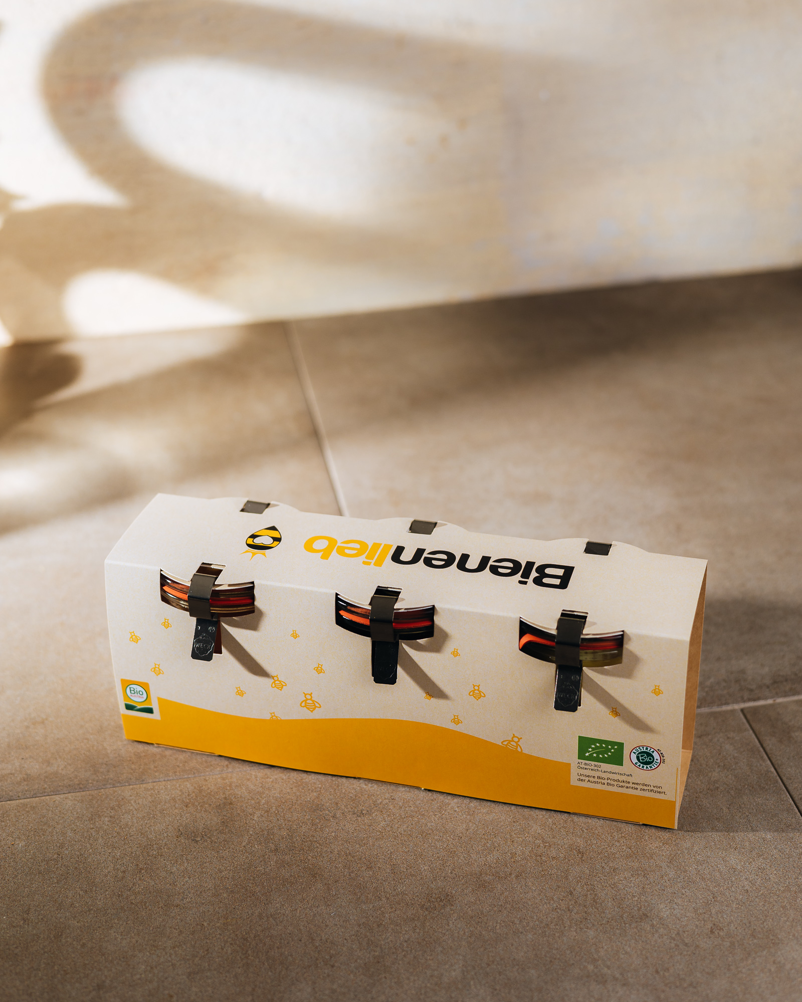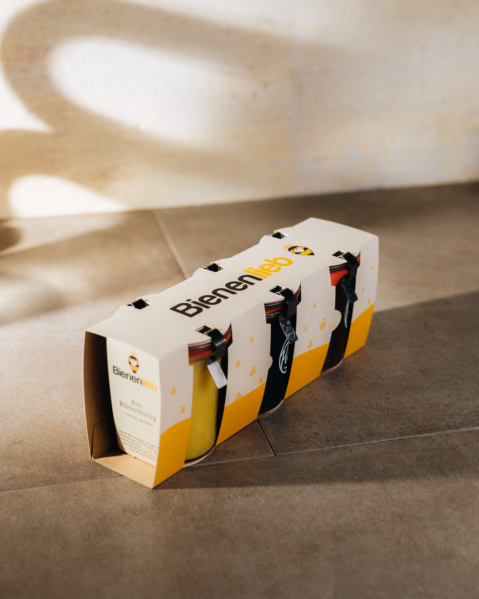 | in verschiedenen Varianten | 3x Honig, 2x Honig und eine Bienenwachskerze im Weck-Glas |