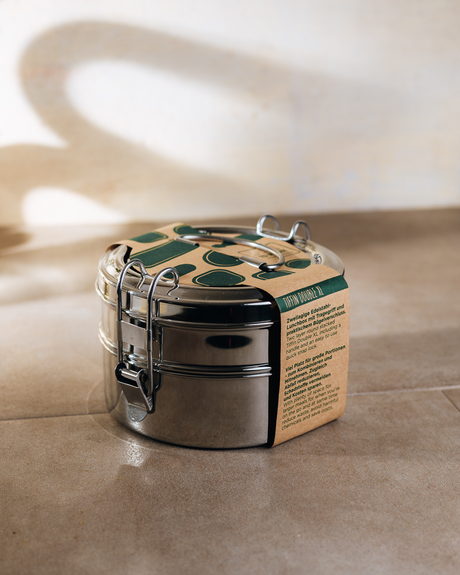 Klassisch runde Edelstahlbehälter wie dieser kommen in ganz Indien seit mehreren Generationen zum Einsatz und werden dort „Tiffin“ genannt. Die zweilagige Version unserer Tiffin Reihe mit extra viel Platz für den großen Hunger. Dank praktischem Tragegriff und zwei Klippverschlüssen kannst du dein Essen sicher und einfach transportieren.