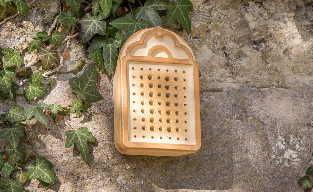 Wildbienenhaus von DENK Keramik. Das Wildbienenhaus ist aus dauerhafter CeraNatur Keramik hergestellt und verfügt über 63 spechtsichere Niströhren mit unterschiedlichem Durchmesser für die am häufigsten vorkommenden Solitär-Insekten.